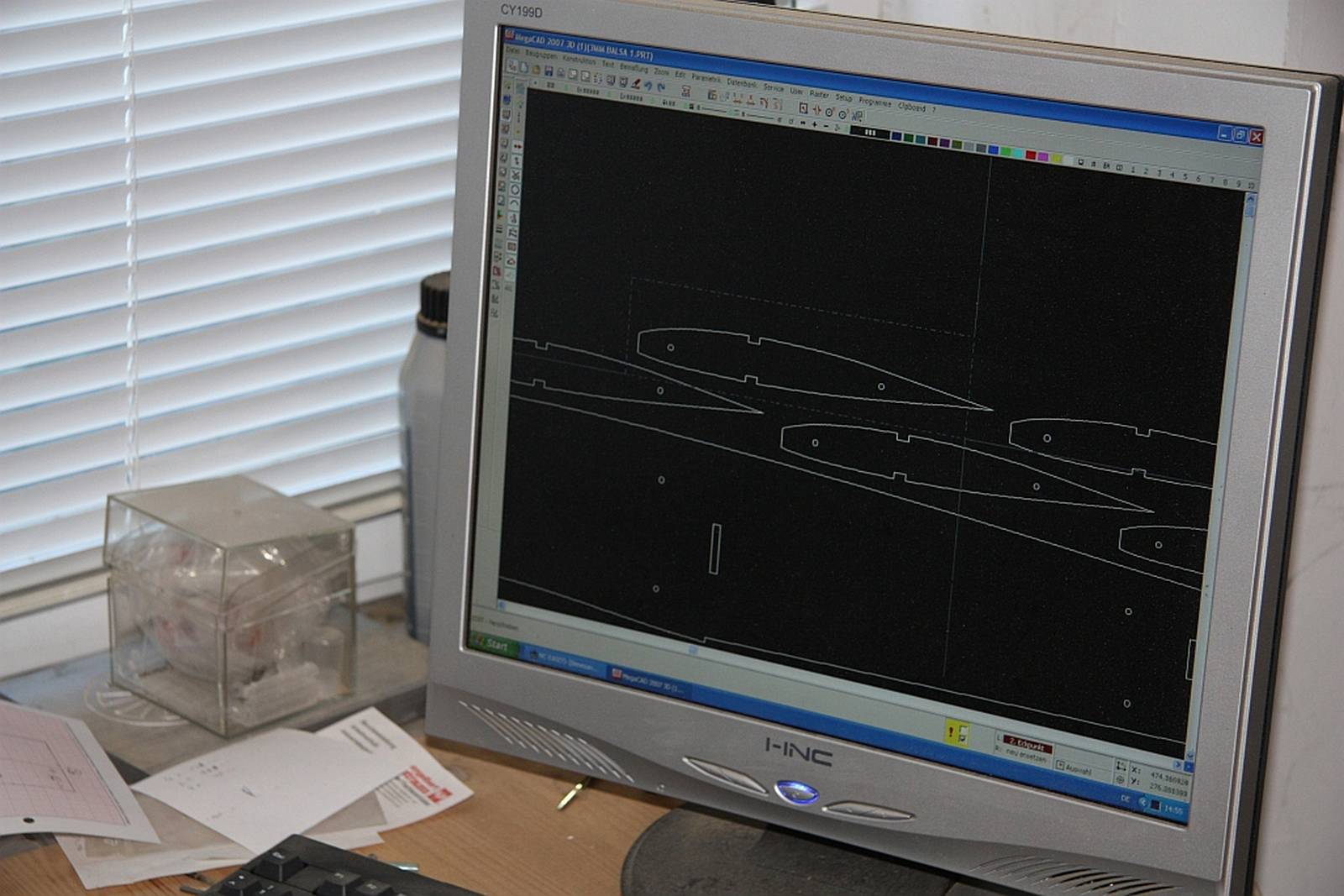 Nachdem Thomas und Lars einige Gnumpf Baupläne aus dem Internet geladen hatten, machte sich Axel daran, daraus eine Fräsdatei zu erstellen und im 3D Programm die Maße zu überprüfen. Anschließend wurden alle Teile auf Axels CNC-Fräse zur Probe aus günstigem Sperrholz gefräst und zusammen gefügt. Alles passte auf Anhieb und alles ist für den ersten Vorseriengnumpf vorbereitet.