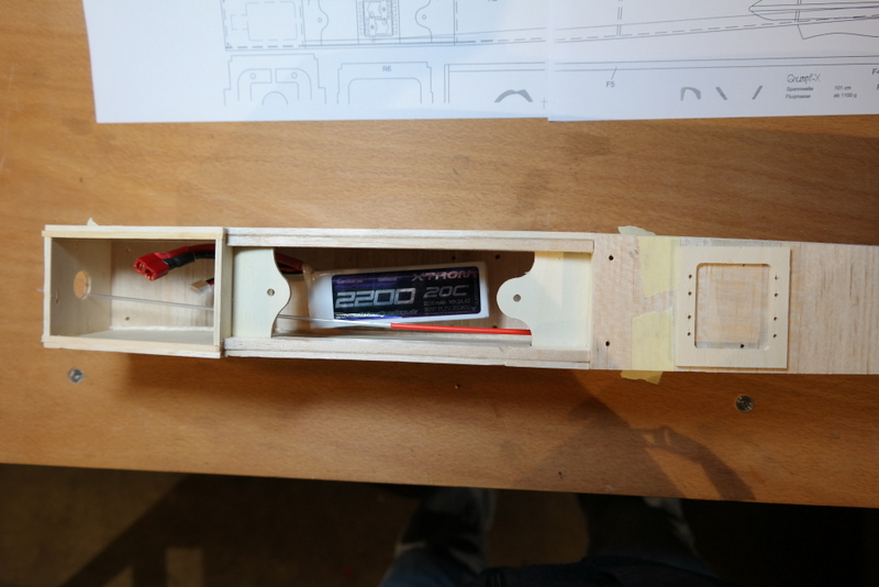 Und es geht weiter! Heute ist der 6 Novmeber und Thomas hat die Nasen- und die Endeisten verschliffen. Die Randbögen sind ausgesägt und angeklebt. Auch die 1. Version der Servoschächte für die Querruder ist eingebaut. Genauso wie das Höhenruderservo. Der 1. Gnumpf wird eine Elektroversion. Der Motor hat bereits seinen Platz gefunden. Eine Herausforderung ist es die Servos in die dünne Tragfläche zu bekommen.